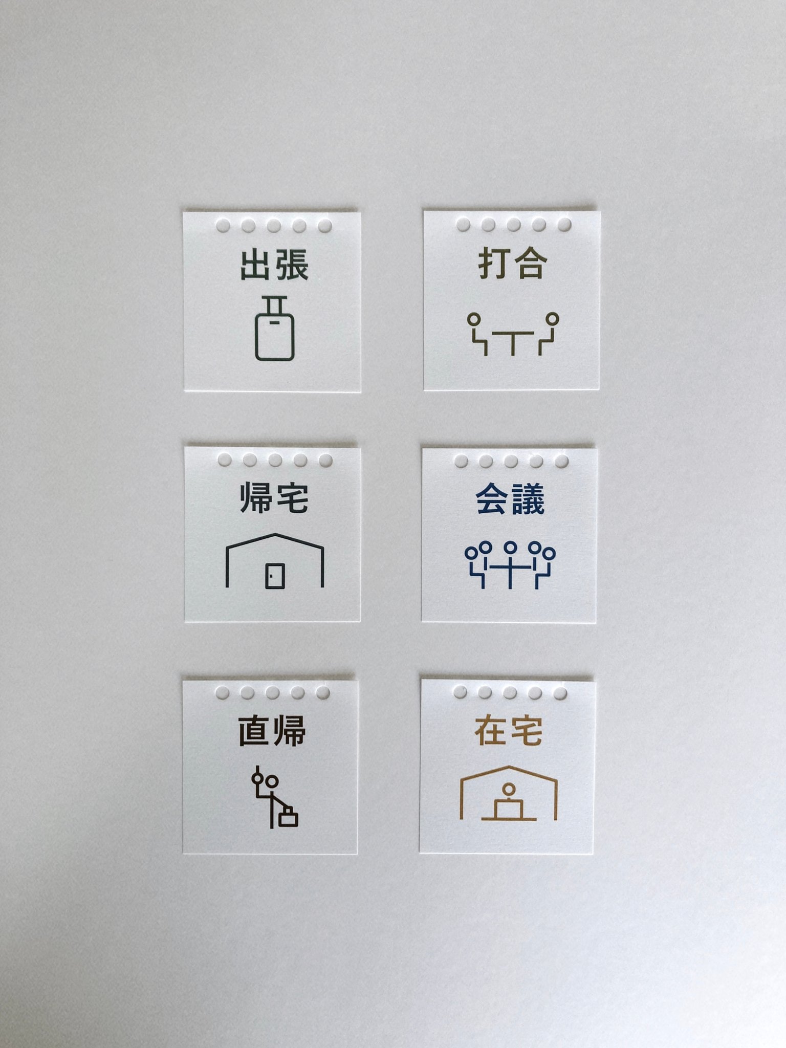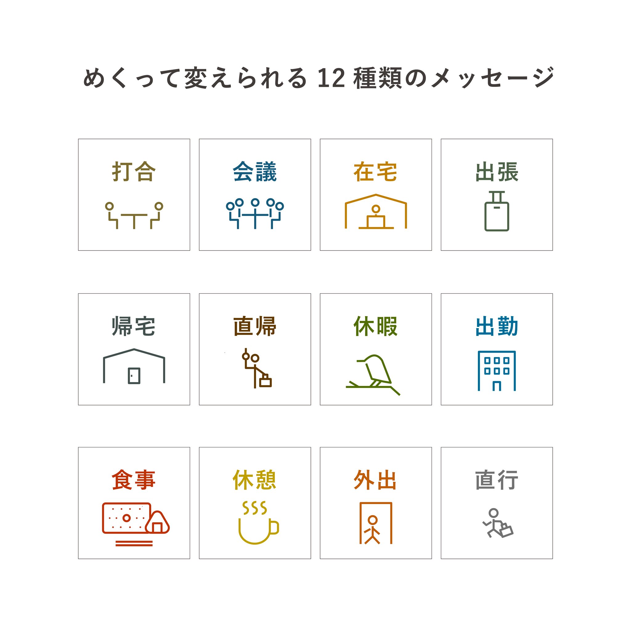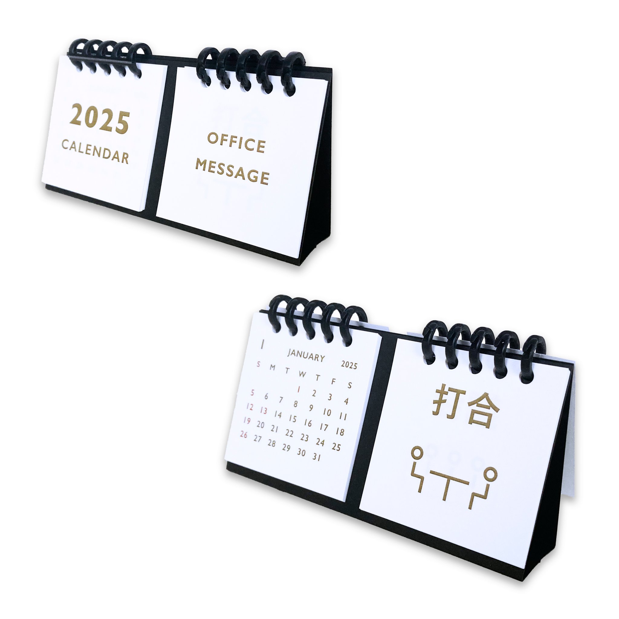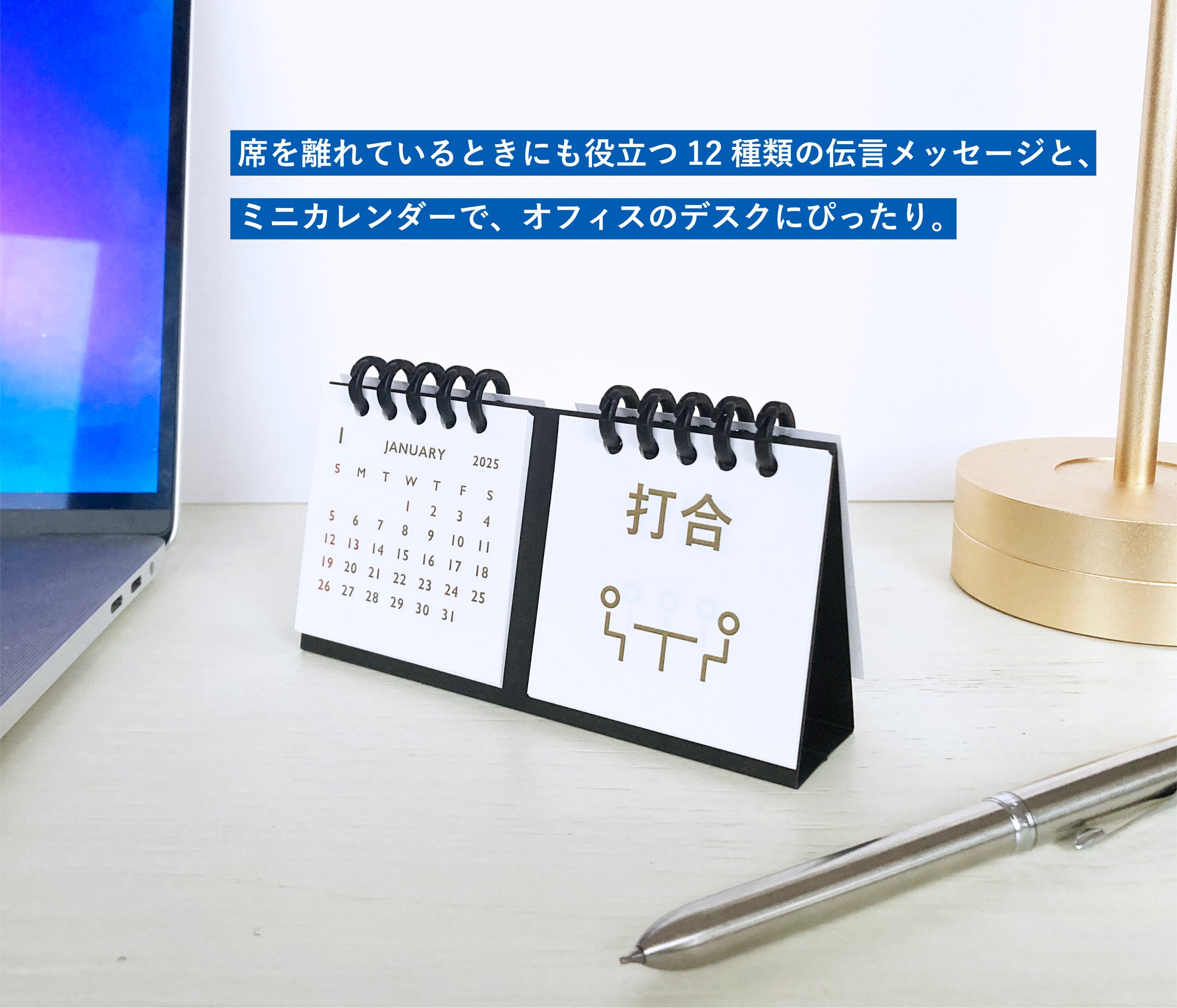 シンプルなアイコンと共にオフィスメッセージを伝える、卓上ミニカレンダー。離席中も、「打ち合わせ」「在宅」などのメッセージをさりげなく訪問者に伝えられ、オフィスワークにぴったり。オフィスメッセージは全12種類。幅約13cmのコンパクトサイズで、省スペース。2025年1月始まり。