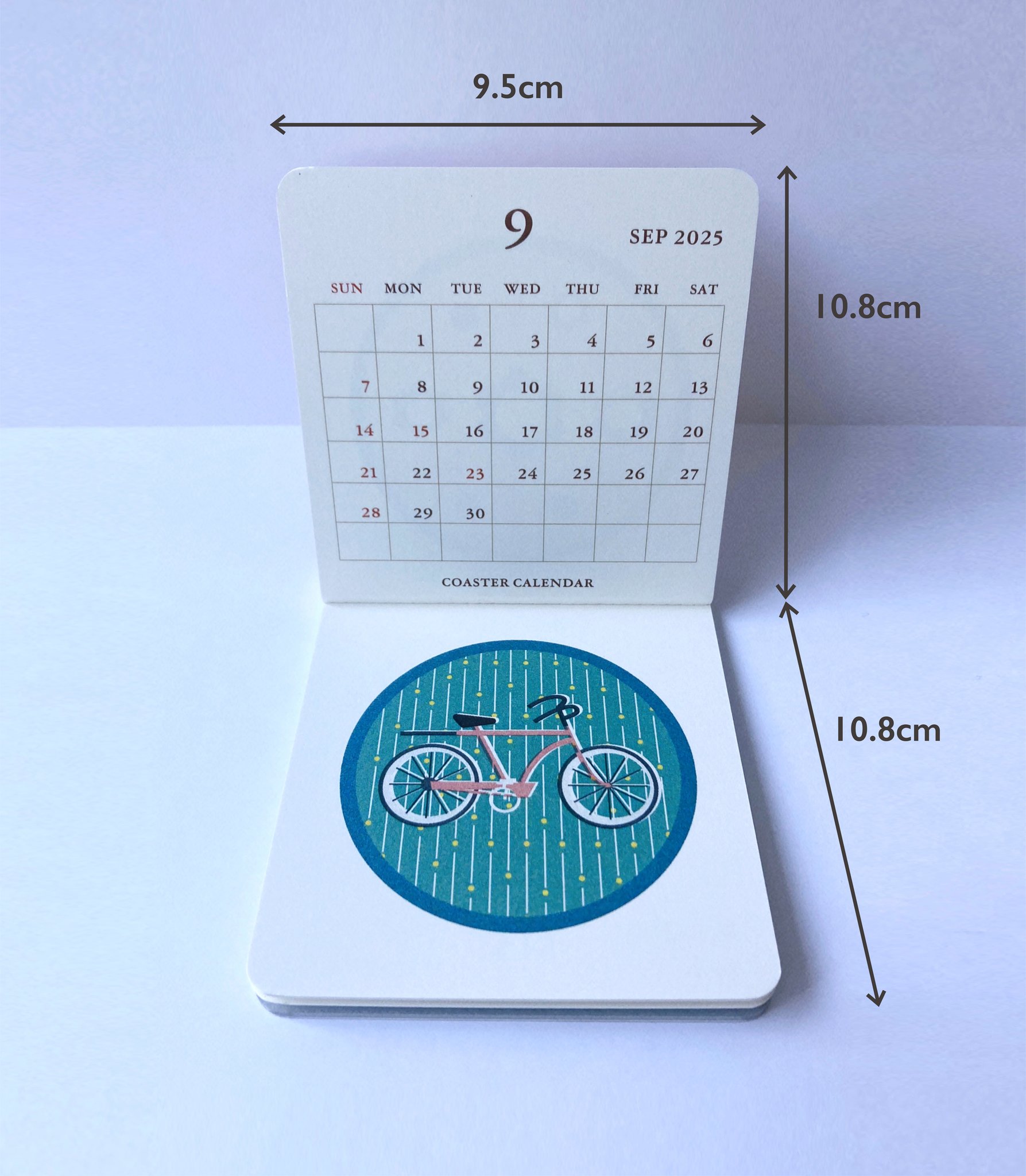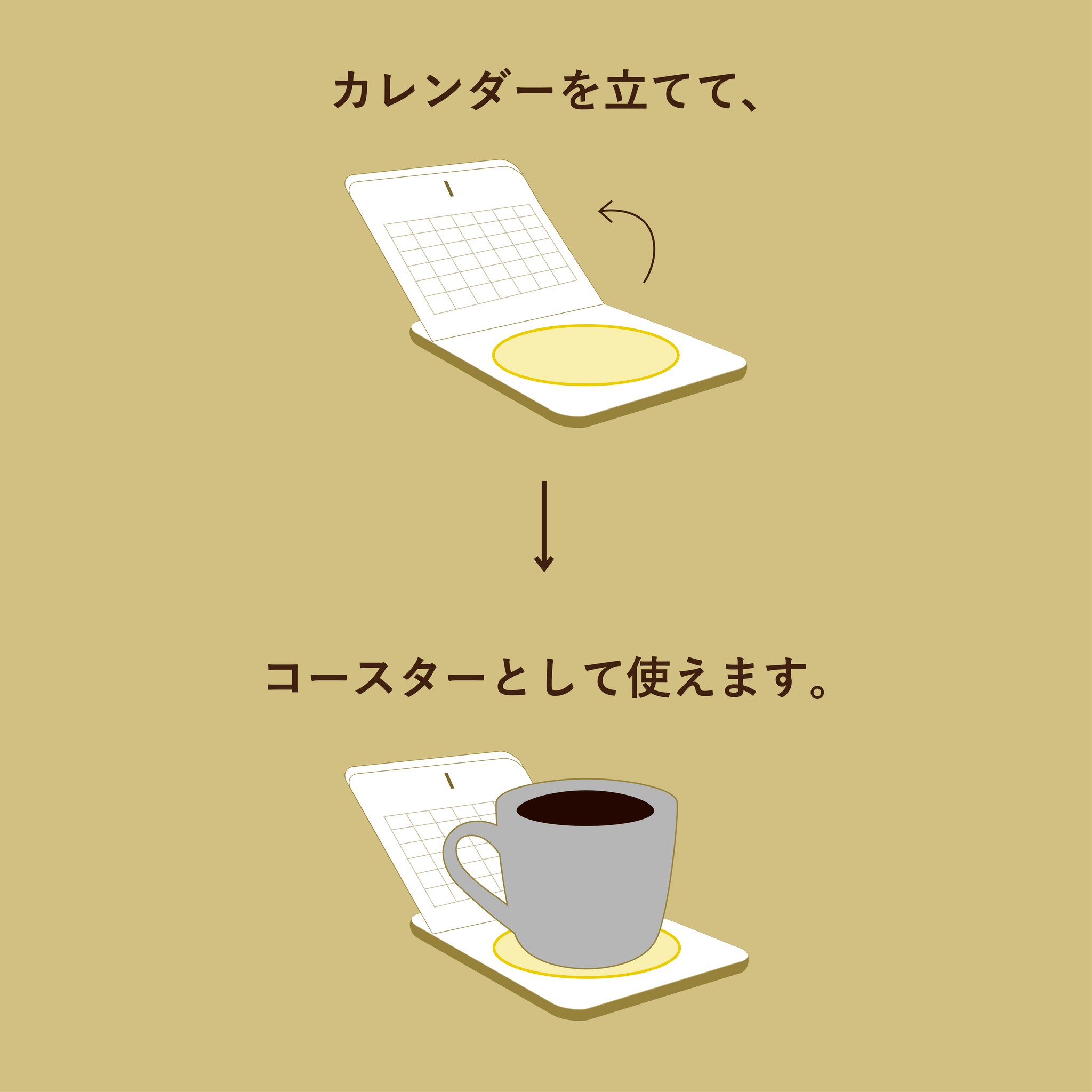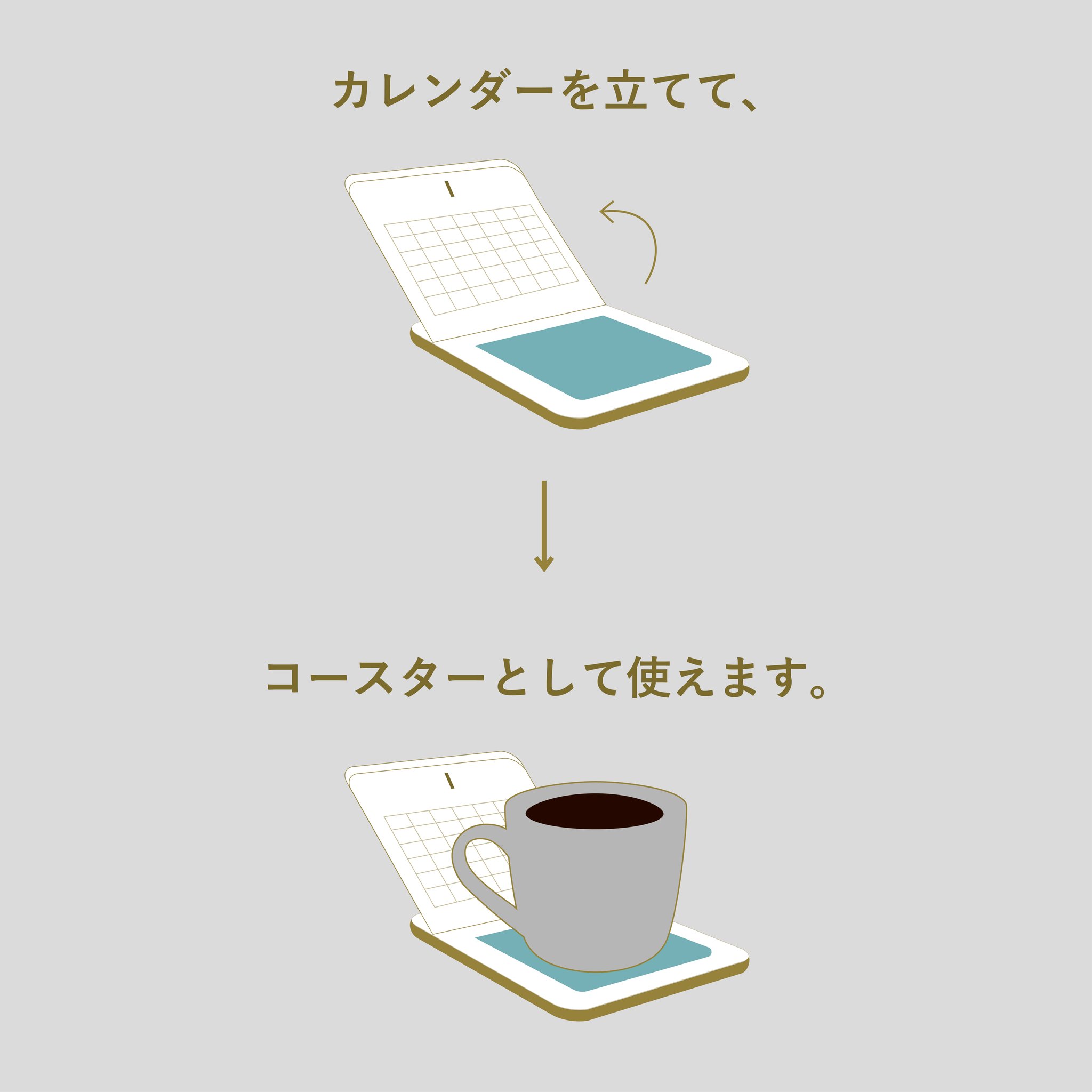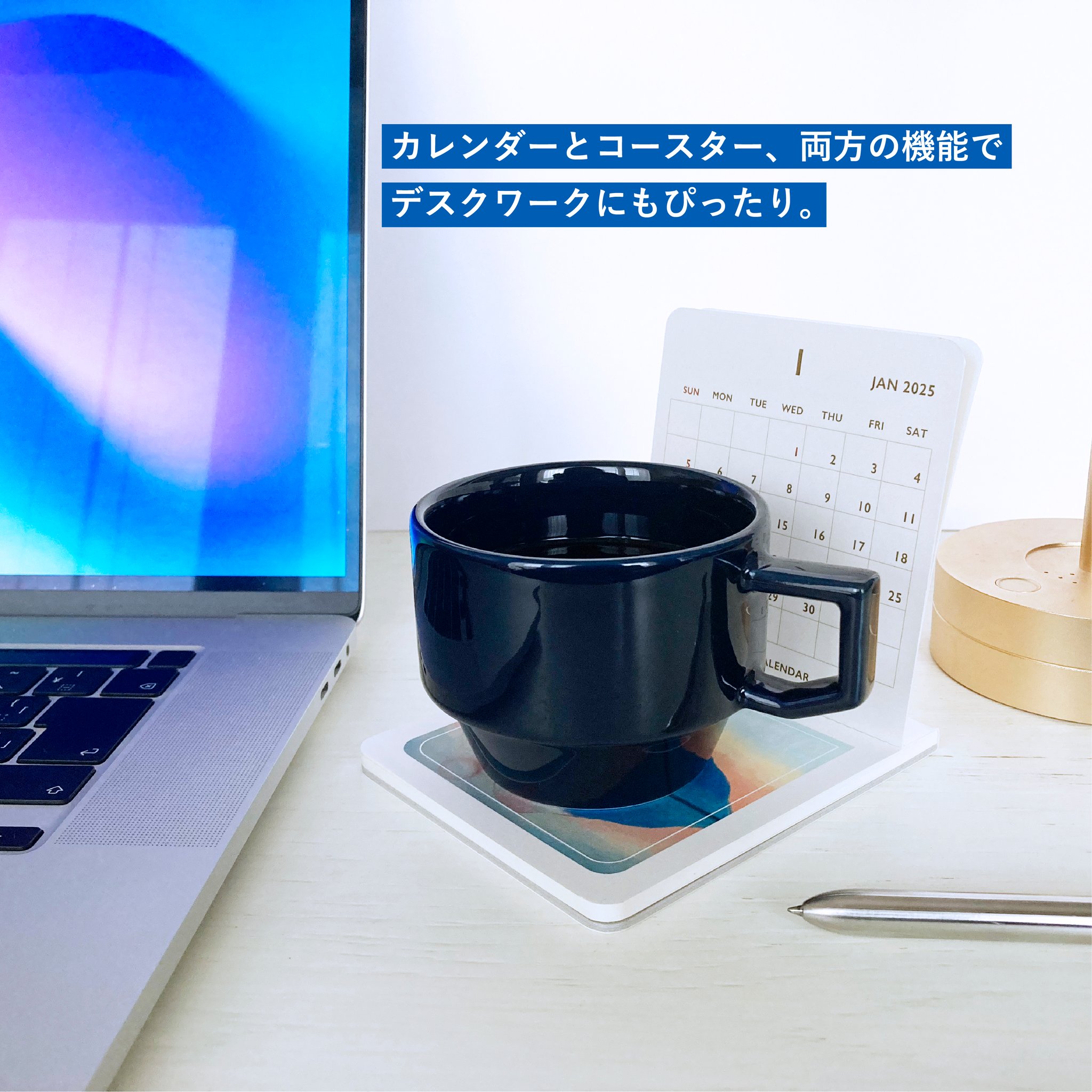 カレンダー兼コースターとして、デスクワークにぴったり。シンプルな洗練されたデザインで、インテリアの一部としても活躍します。月ごとに変わる、北欧をイメージした12種類のコースターデザイン。2025年1月始まり。
