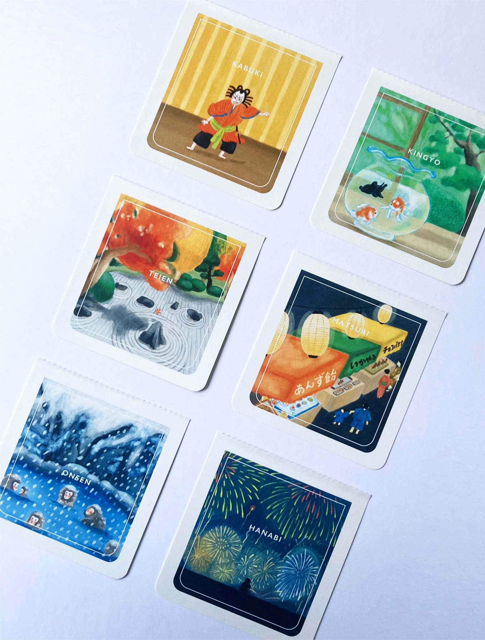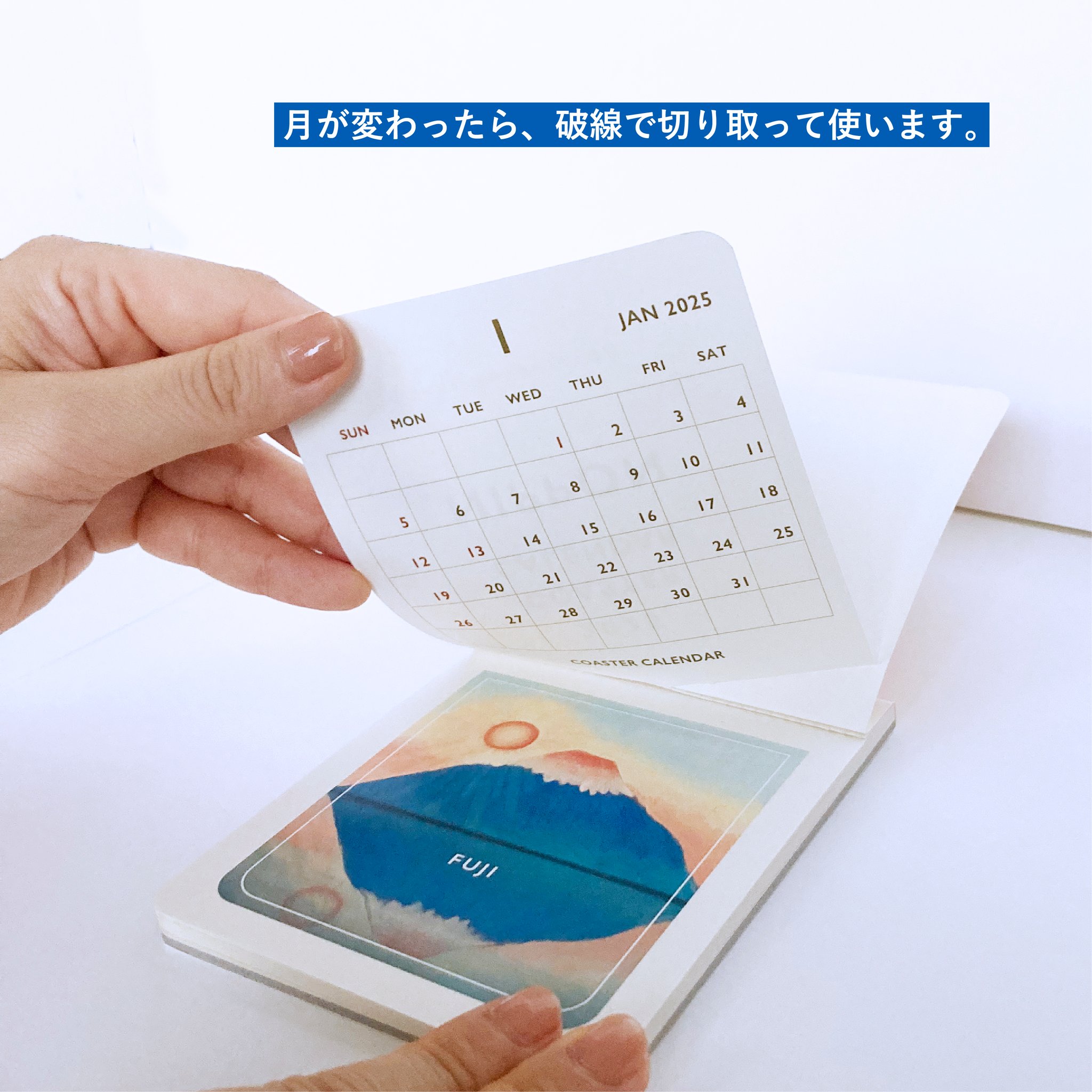カレンダー兼コースターとして、デスクワークにぴったり。日本のうつくしい風景を描いたイラストのコースターと、その場面を表す英字表記で、海外の方へのギフトにもおすすめです。 月ごとに変わる、12種類のコースターデザイン。2025年1月始まり。