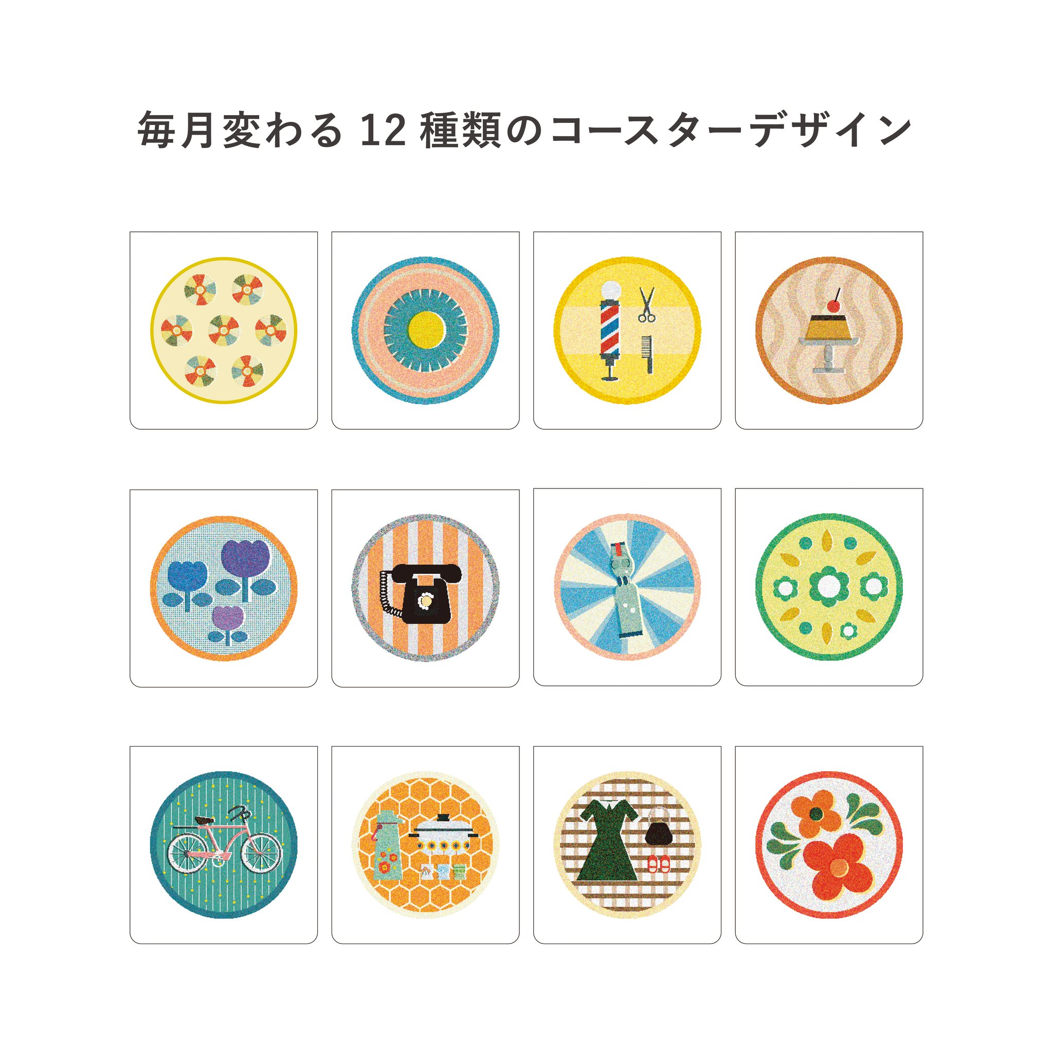 カレンダー兼コースターとして、デスクワークにぴったり。トレンドのレトロデザインで、インテリアの一部としても活躍します。月ごとに変わる、12種類のコースターデザイン。2025年1月始まり。