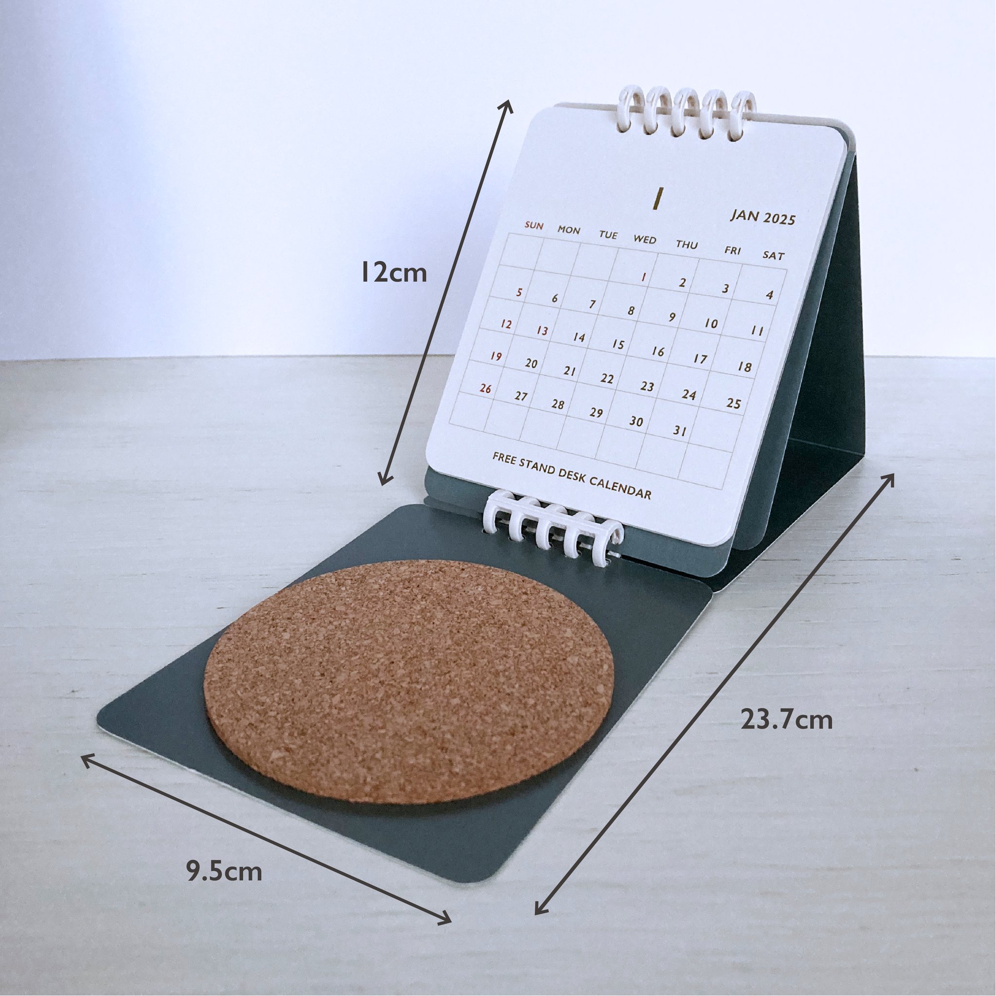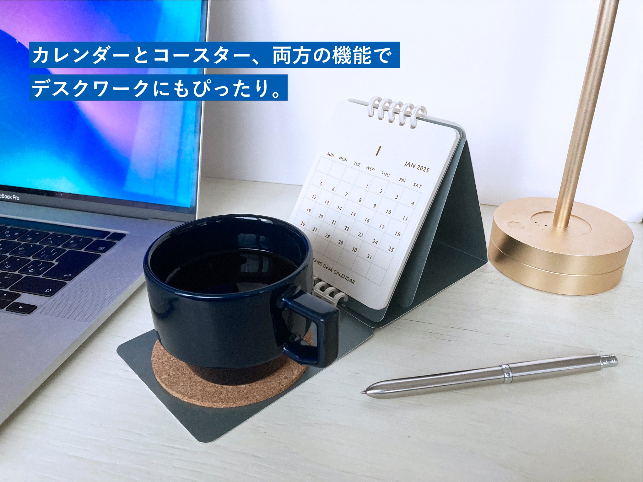 折りたたみ式で、広げると、カレンダーが立ち、耐久性のあるコースターが付いている、コースターと一体化したカレンダー。コンパクトにまとまり携帯できるので、フリーアドレスオフィスにも。2025年1月始まり。
